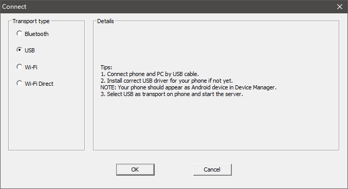首先是手机端,一定要打开USB调试模式,安装完软件打开是这个样子的: