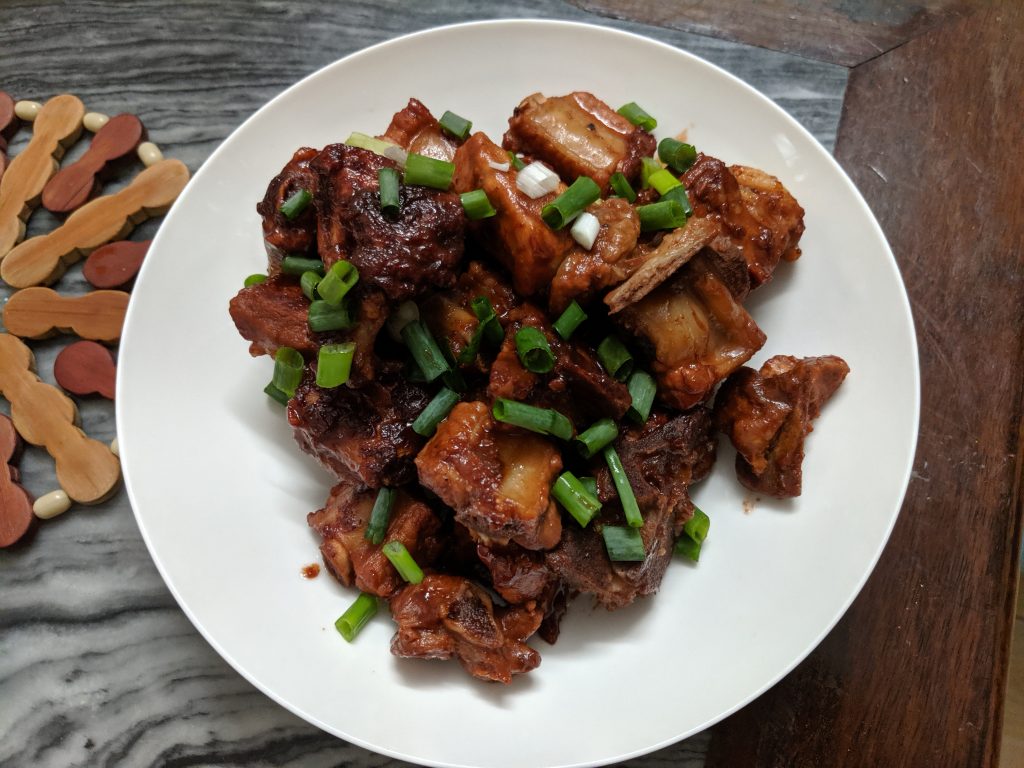 - 锅里面少许底油,油热了,把排骨和蒜放进去,排骨煎一下,煎出颜色把油倒出来
