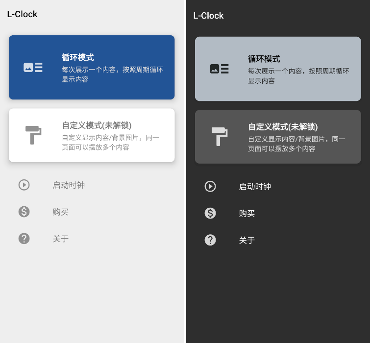 打开软件首页如图,L-Clock 支持深色/浅色模式,主要分为两大功能:循环模式和自定义模式。