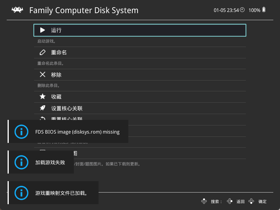 另一种情况则是选择对应游戏和内核后,运行游戏时提示缺少文件,如下为运行 FDS 平台 超级马里欧兄弟 时遇到的错误