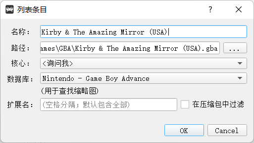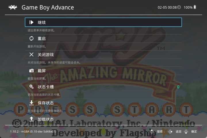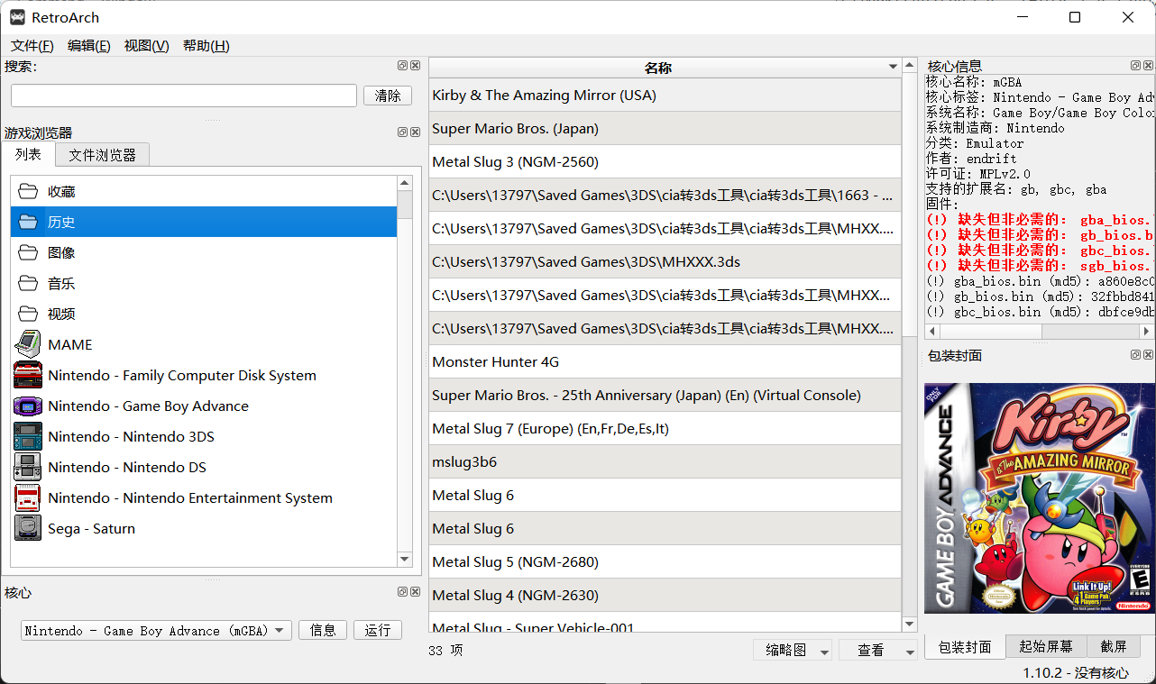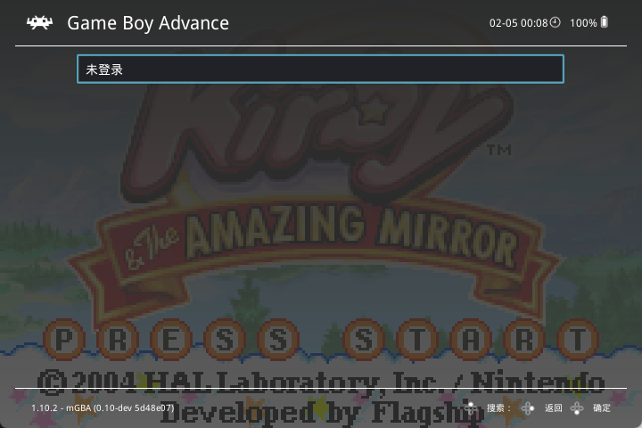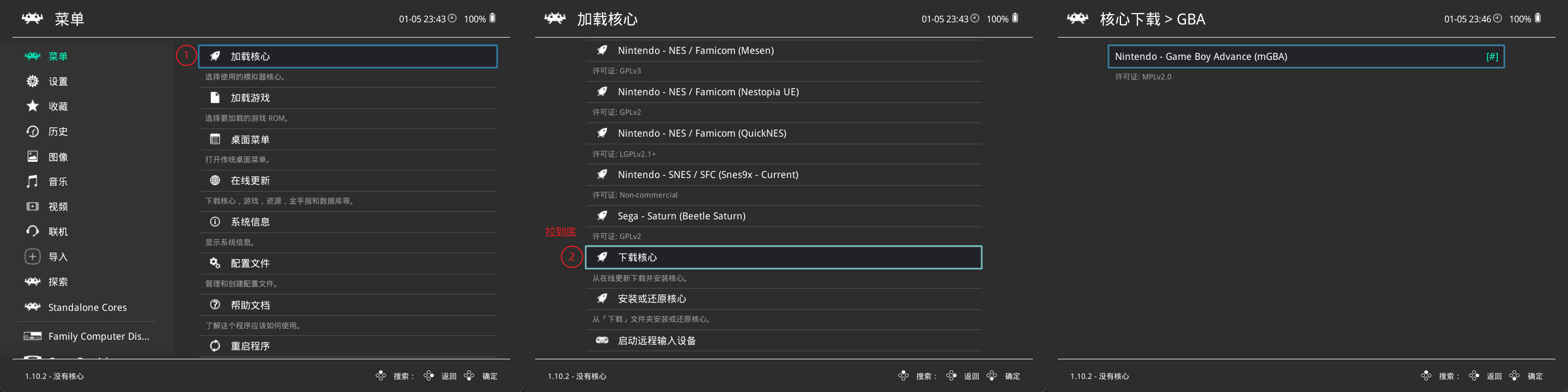 通常情况下运行游戏是很简单的,以运行 GBA 平台的星之卡比为例,软件首页打开 菜单 → 加载核心 拉到底下载,搜索对应内核名字下载即可