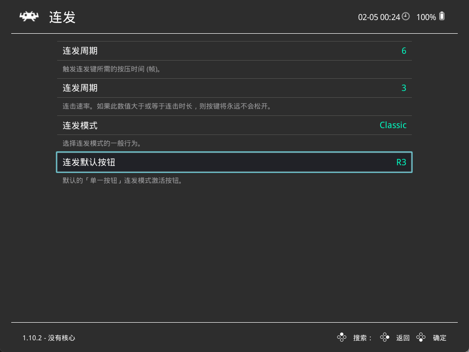 上面的游戏暂停菜单,有个连发设置,但是那个是没有用的,你要在软件的 设置 → 输入 → 连发中 设置,也就是文章开头介绍软件界面键位时图片所演示位置。