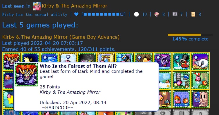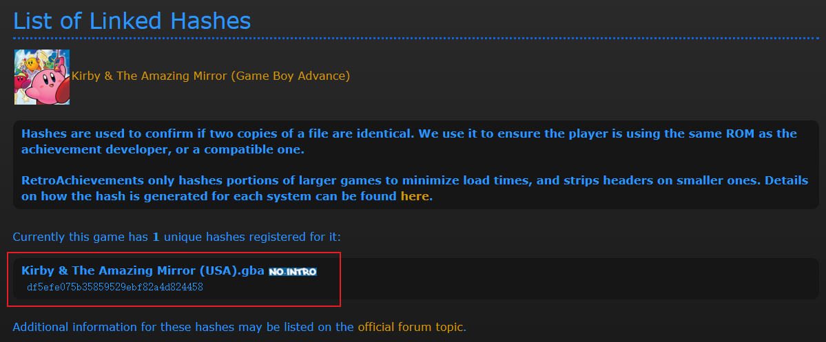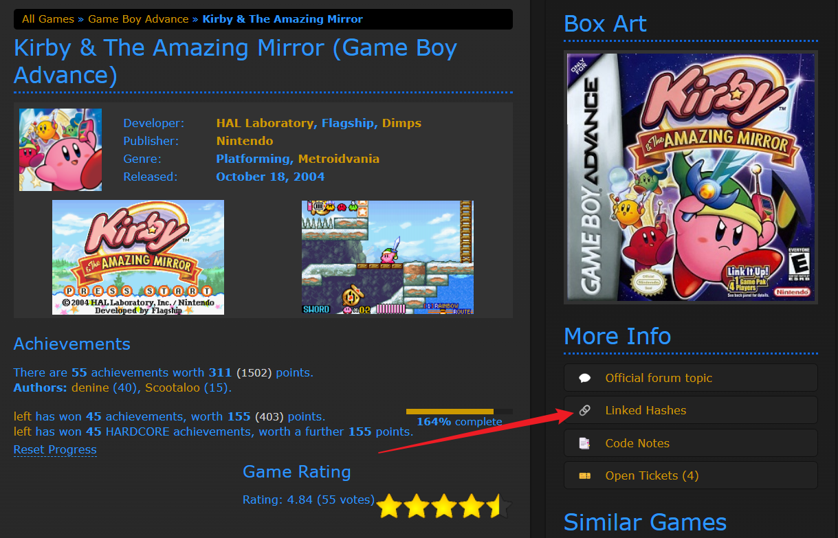 游戏文件则需要使用 RetroAchievements 网站指定的 Rom ,以下以星之卡比为例,在网站中搜索游戏,在游戏详情页面点击 Linked Hashes