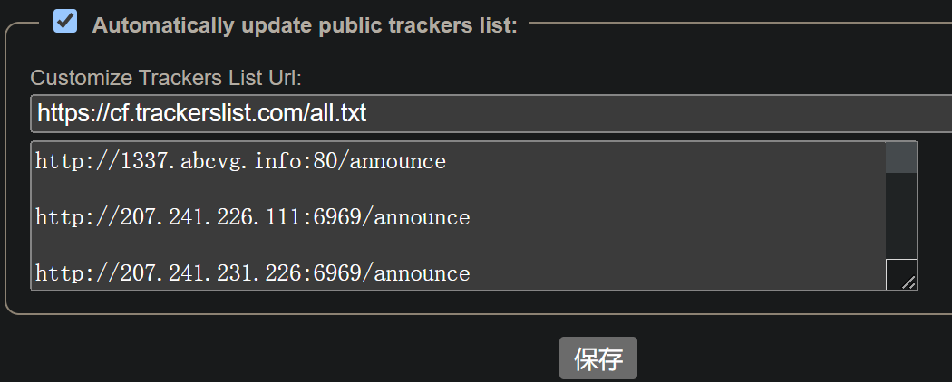 其实我更推荐 qBittorrent-Enhanced-Edition ,这个版本的 qBttorrent 屏蔽了迅雷等吸血客户端,而且 tracker 可以直接添加上面仓库的 List URL ,自动更新
