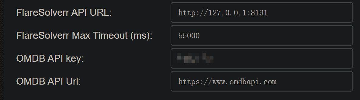 为了更好的使用体验,推荐把 FlareSolverr 和 OMDB API 都配置好