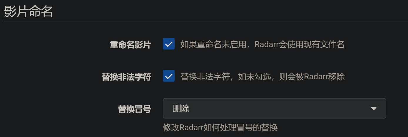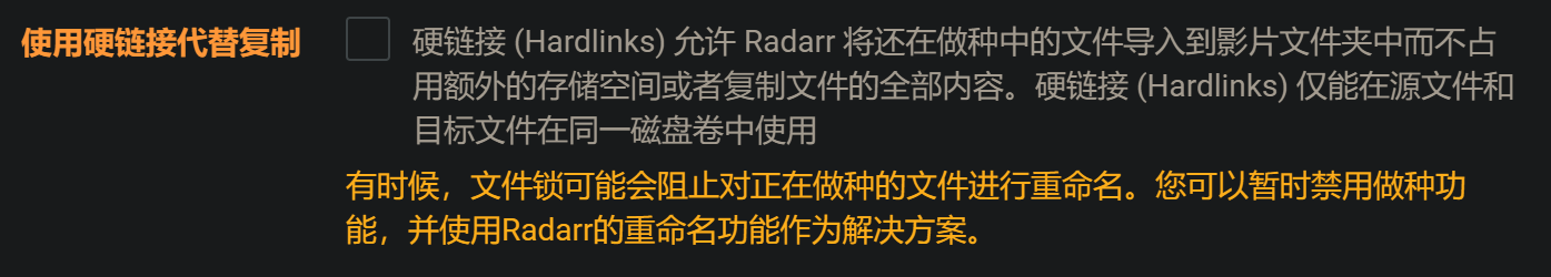 个人推荐关闭 使用硬链接代替复制,Radarr 的下载逻辑是,当添加下载任务,会先下载到 qBttorrent 的默认下载目录,当下载完成,会将下载好的文件复制到你设置的存放电影的目录