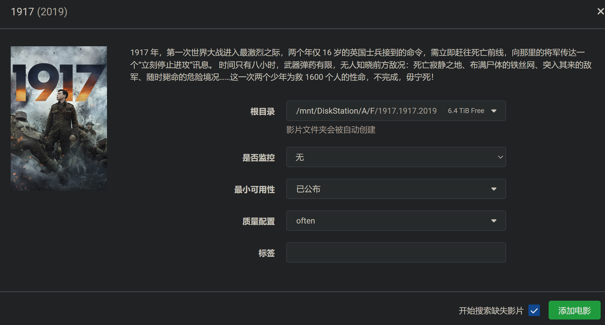 设置好 根目录 后在添加下载时 Radarr 会显示你存放电影的目录,不用担心,Radarr 仍然会先下载到 qBttorrent 的默认下载目录,下载完成后会自动复制过去
