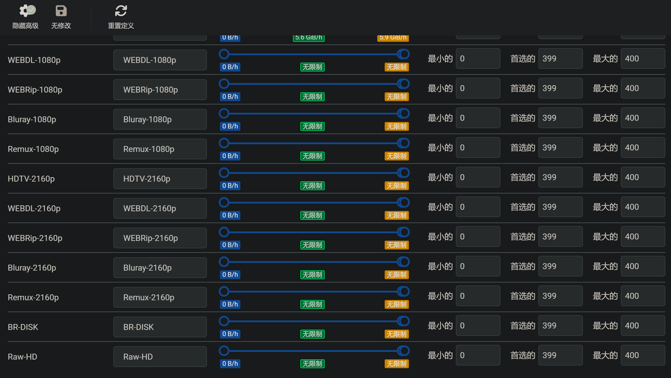 先设置 媒体质量,按图中所示将 WEBDL-1080p 之后的全部拉到无限制,这么做是因为文件大小并不是严格按照 Radarr 的默认设置来的,我们也不需要这里的质量设置来挑选我们需要的电影,精细化的配置都交给 自定义命名格式 处理会更好