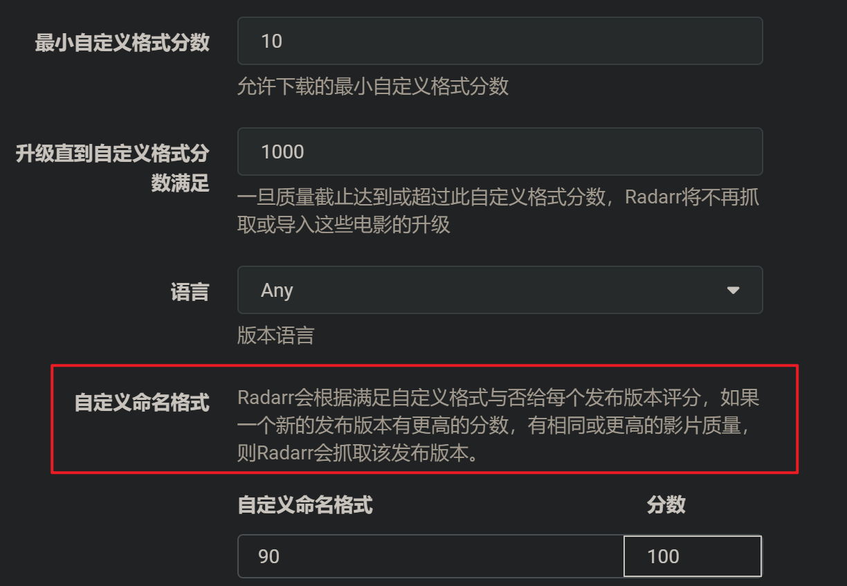 简而言之就是 Radarr 在搜索一部电影时,除了会按照影片质量排序,还会根据你设定的 自定义命名格式 进行评分,会优先下载分数更高的影片,确保下载的电影符合个人偏好,下面给出一个例子: