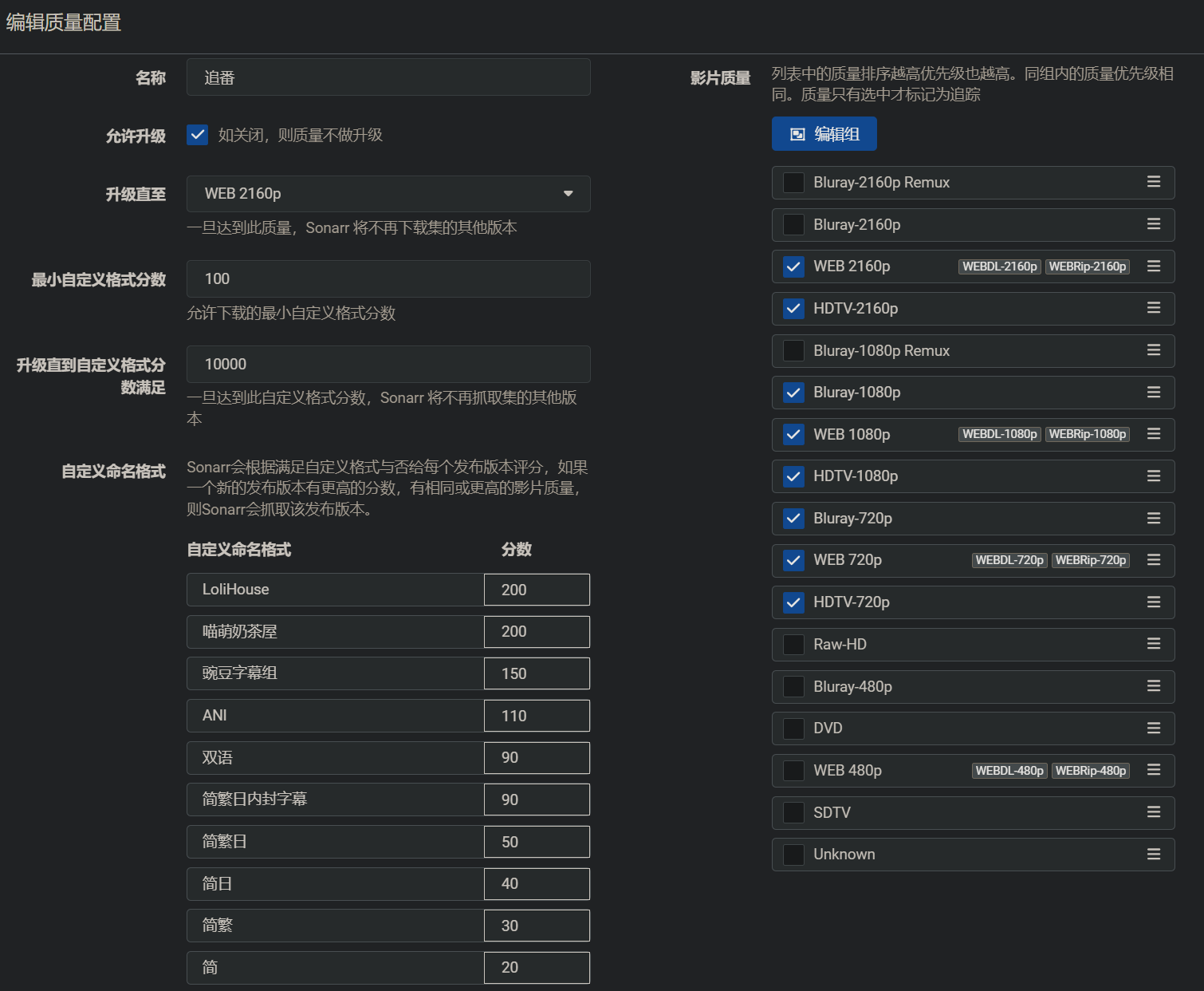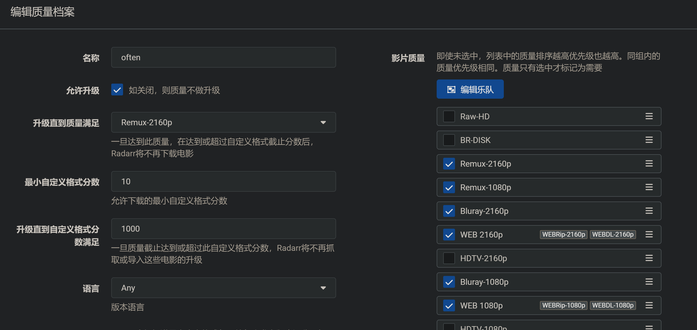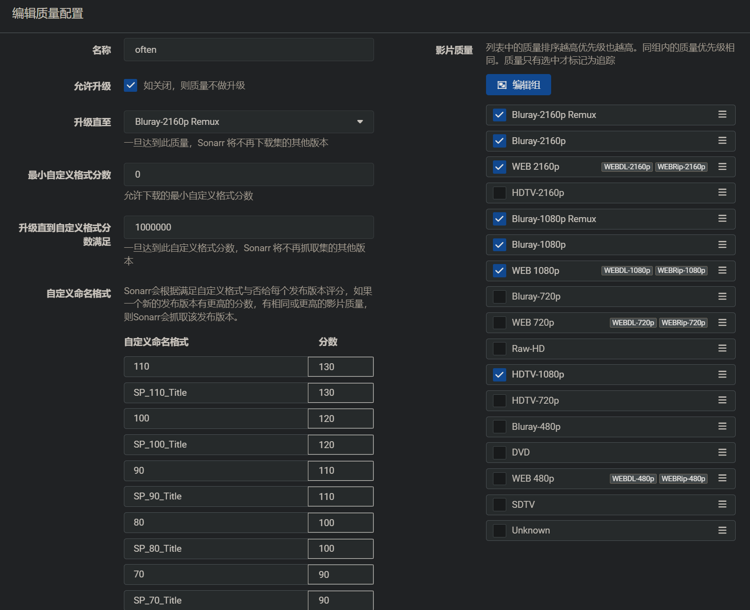 这里就是配置当 Radarr 下载电影时,可以下载哪些质量的电影;我个人是下载 1080p 然后升级直至 Remux 2160p