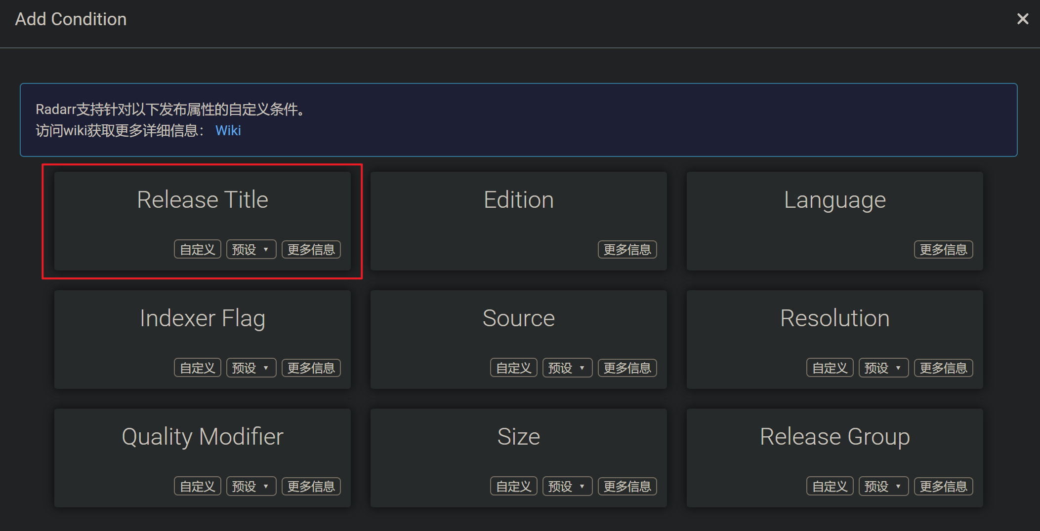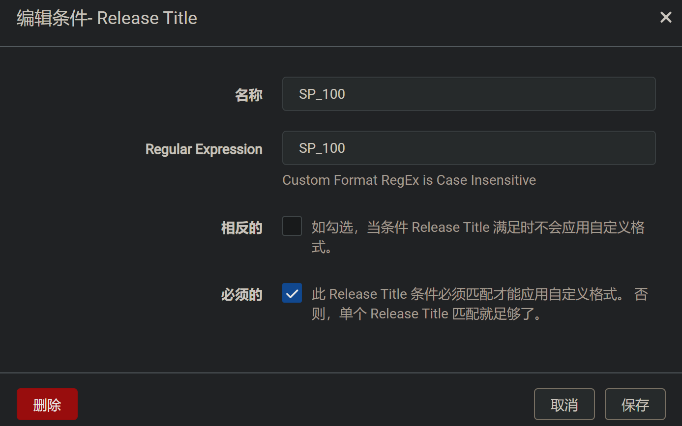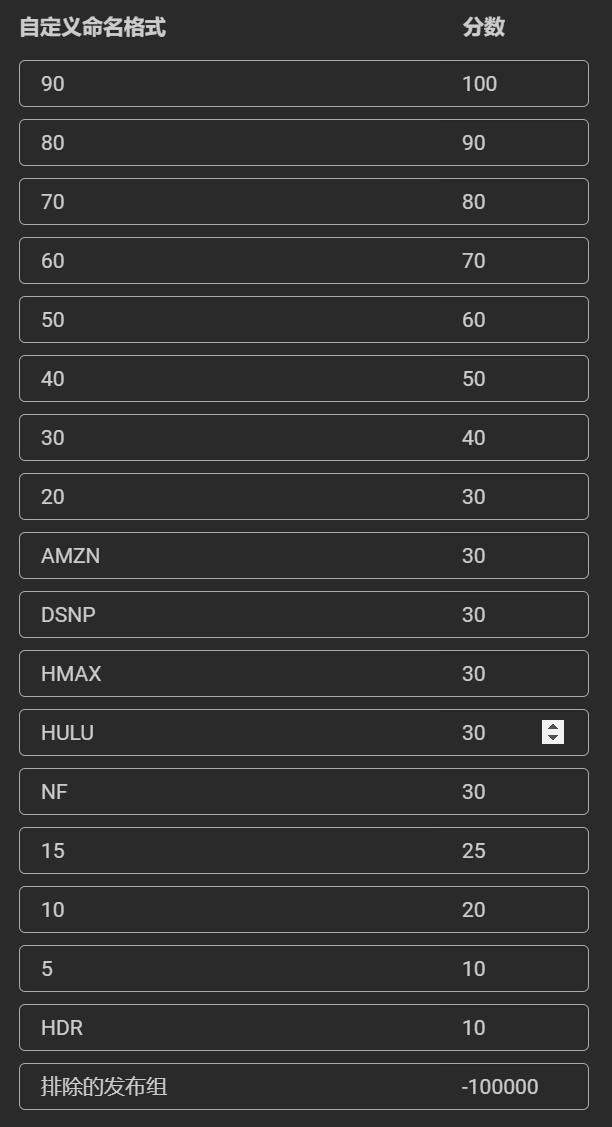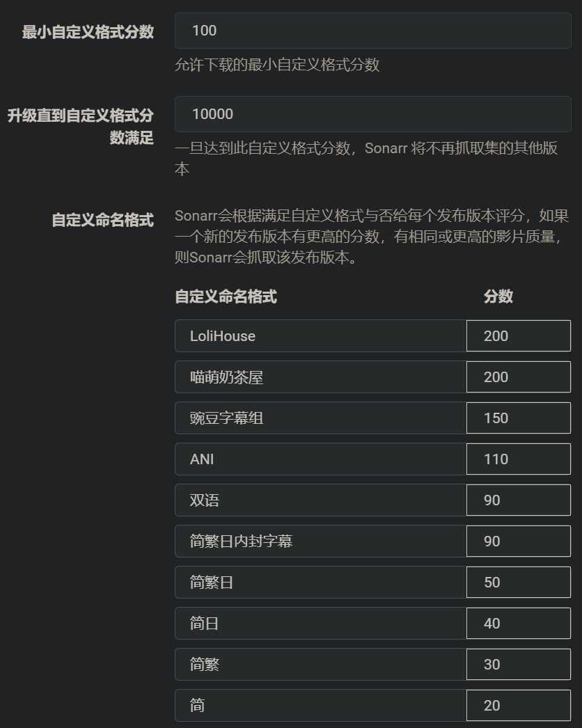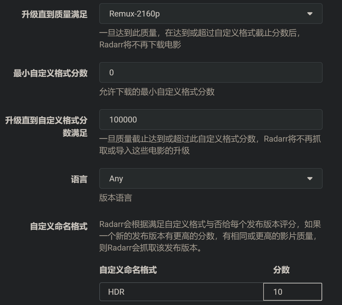 这样设置后,当 Radarr 搜索电影时,同等质量下,标题包含 HDR 的资源分数为 10 分,不包含的分数为 0 分,Radarr 就会优先下载这个分数更高的资源,这样我们设置多个 自定义格式 就能更精确的下载符合我们个人偏好的文件