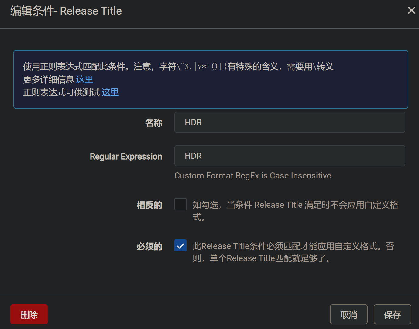 增加一个条件,选择 Release Title ,意思是根据种子标题进行匹配,匹配内容为 HDR