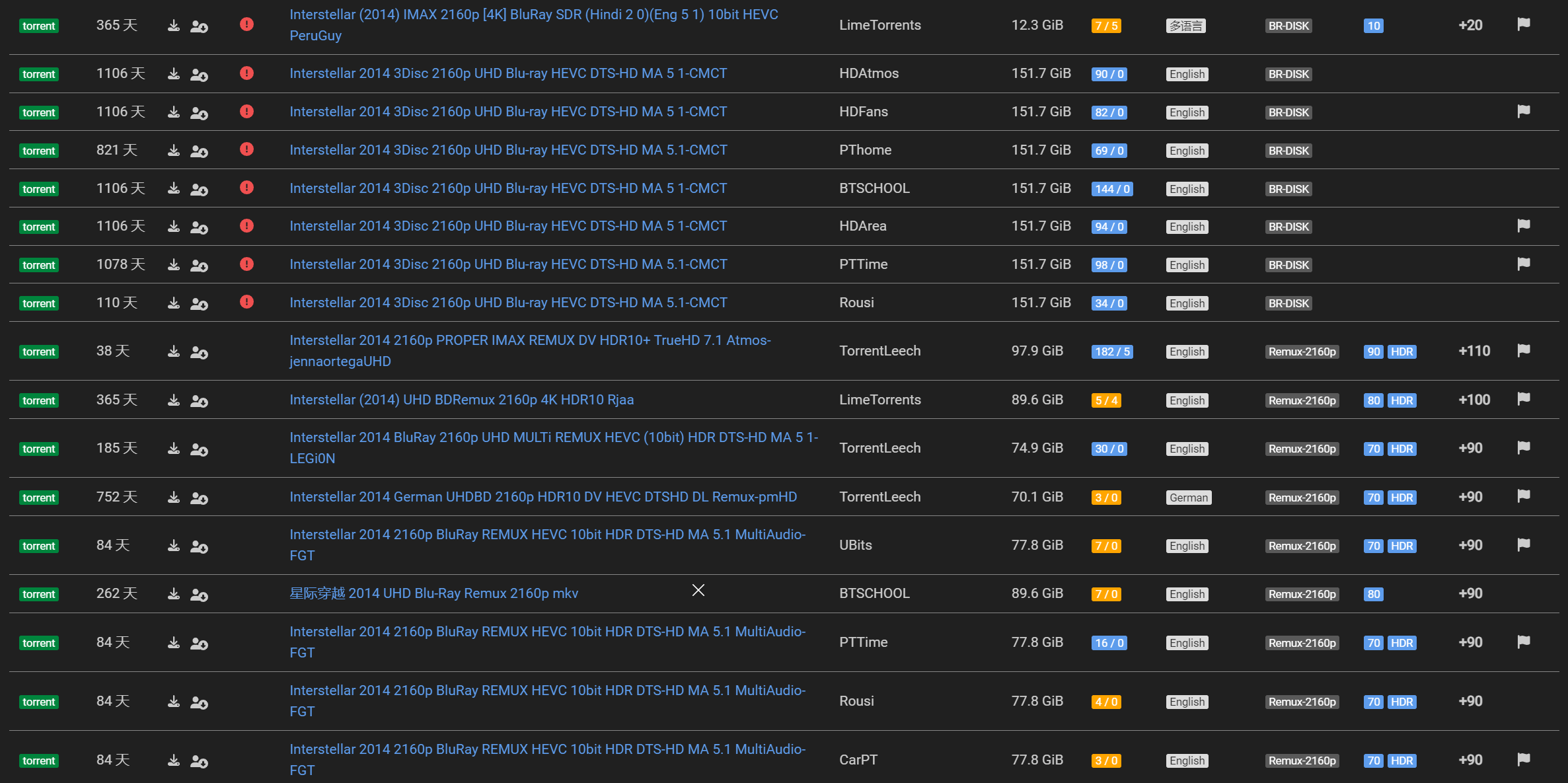 右侧的蓝色标签就代表了匹配到的 自定义格式 ,+110 则是根据匹配到的 自定义格式 得出的分数, 相同媒体质量下根据分数排序,就这样,通过设置 自定义格式 ,我获得了最符合我个人偏好的资源