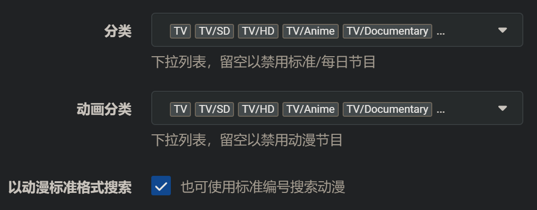 Sonarr 分类部分多了一个 动画分类 ,建议把它和默认分类设置为一样的,并不是所有站点都能做好分类,而且就中国用户而言 Sonarr 并不能很好的处理番剧,后文会详细讲解追番设置