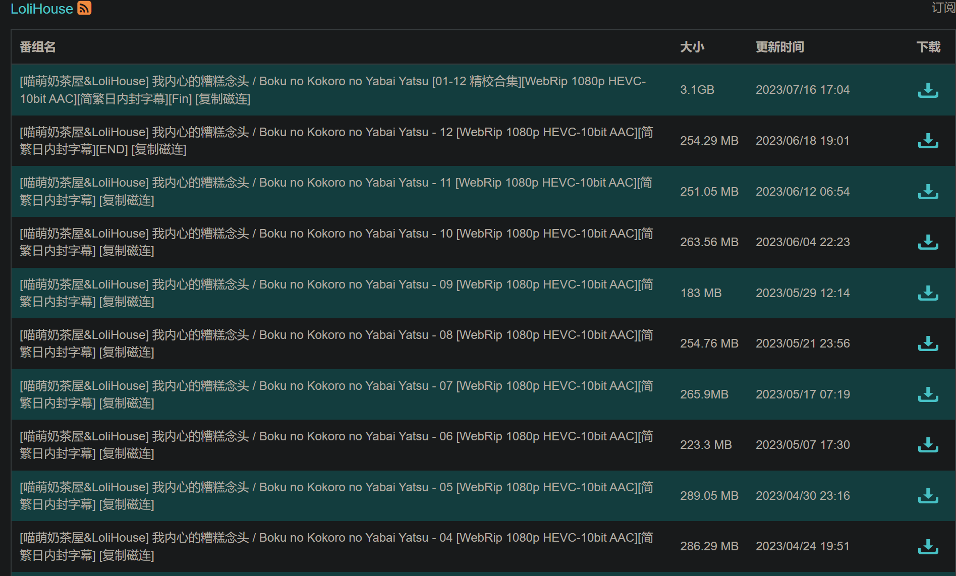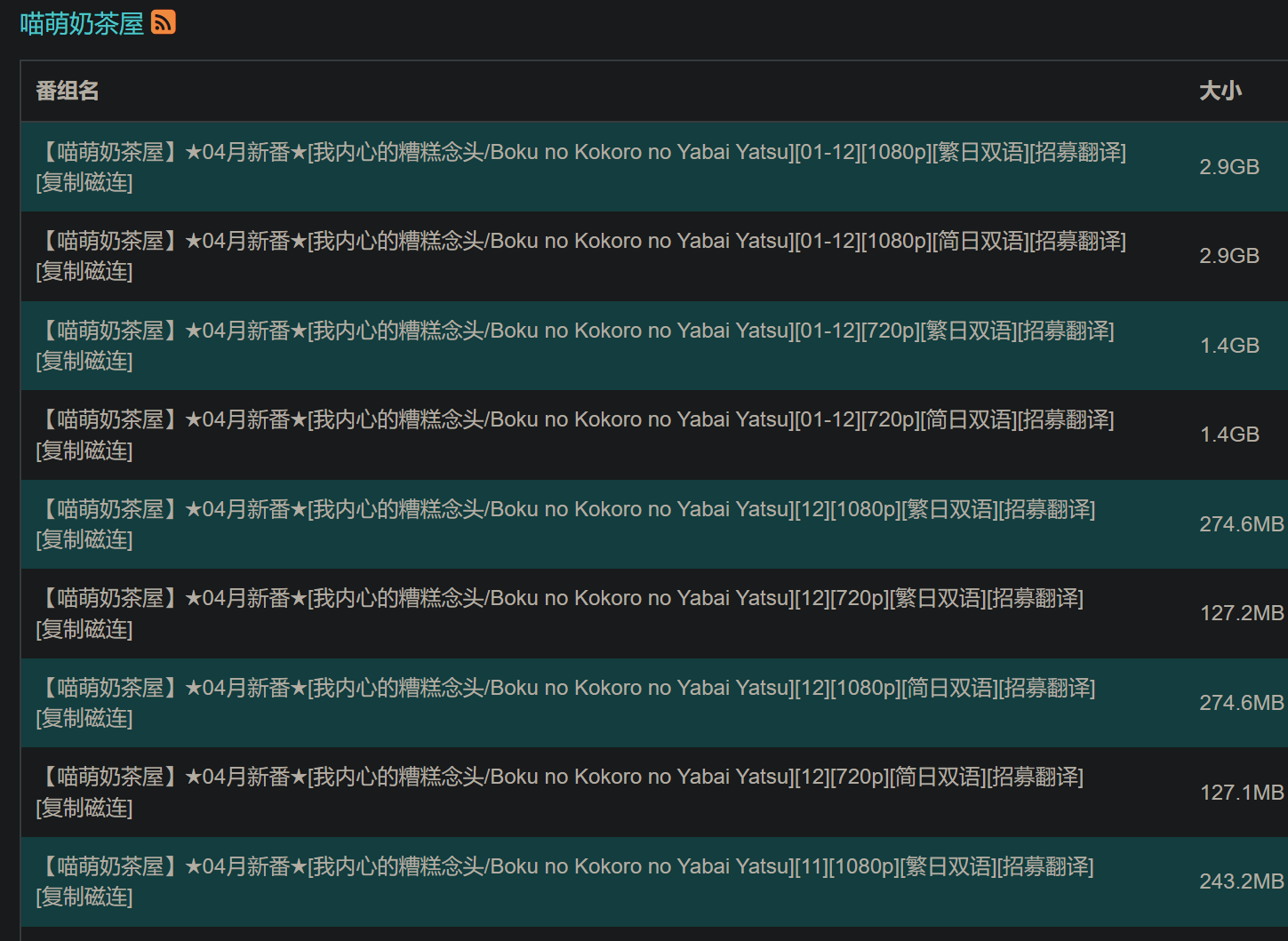 可以看到同一部番剧不同的字幕组命名方式根本不一样,最重要的是名称内根本不包含英文名,而 Sonarr 搜索剧集时是以英文名来进行匹配的,所以默认情况下 Sonarr 根本匹配不到国内字幕组的资源,只能匹配到生肉资源