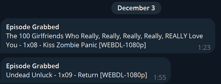 这个部分用来管理 Radarr 的通知,支持的通知方式很多,我个人选择 Telegram 通知,如果你也使用 Telegram ,可以使用我的 脚本 ,优化了通知样式,更加美观,如图左边为默认通知,右边为脚本优化后
