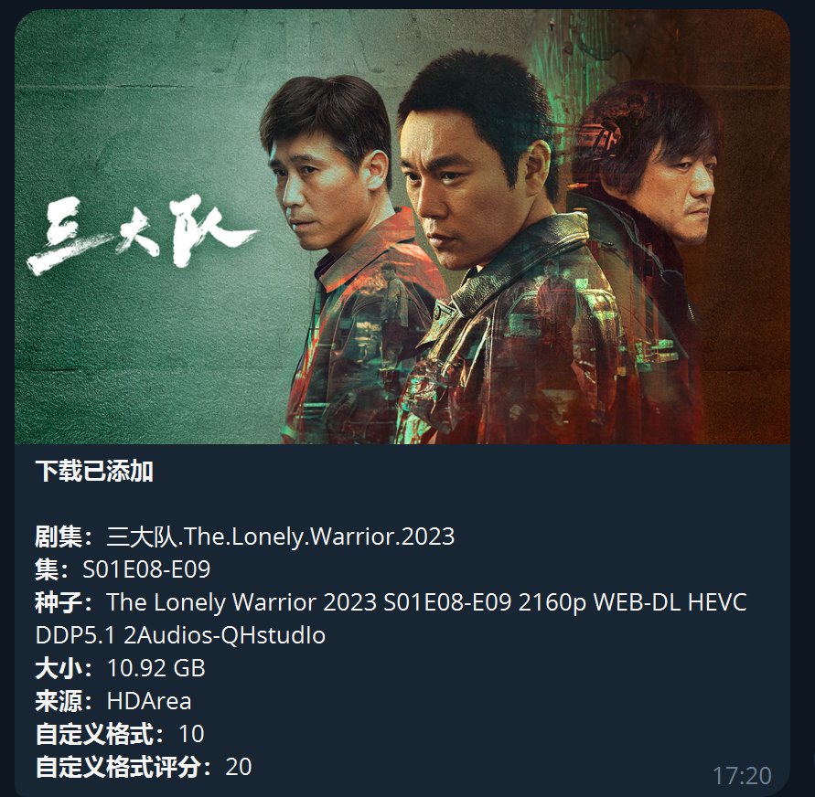 可以看到,Sonarr 获取到的资源是两集一起的,匹配到了 10 G 的 自定义格式 ,评分 20,但因为导入的时候是根据单集重新计算的,所以评分变成了 10