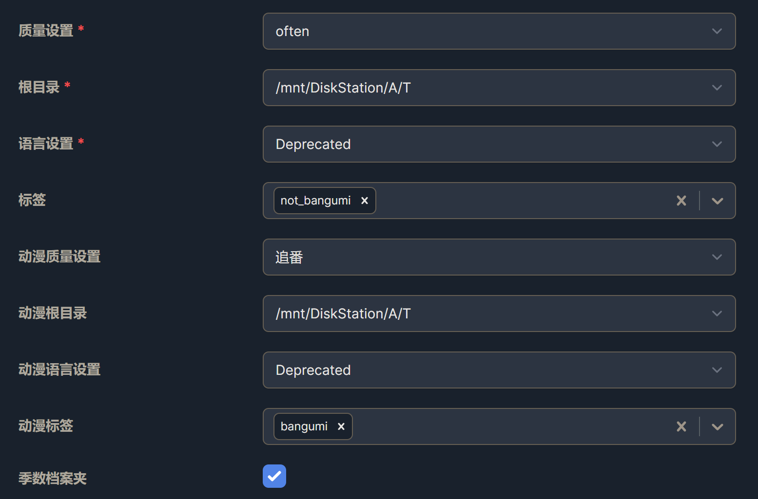 在追番结束后想要洗版的时候,就可以把标签改为 not_bangumi ,质量配置文件改为另一个通用的,这样就会搜索所有站点寻找质量最好的资源