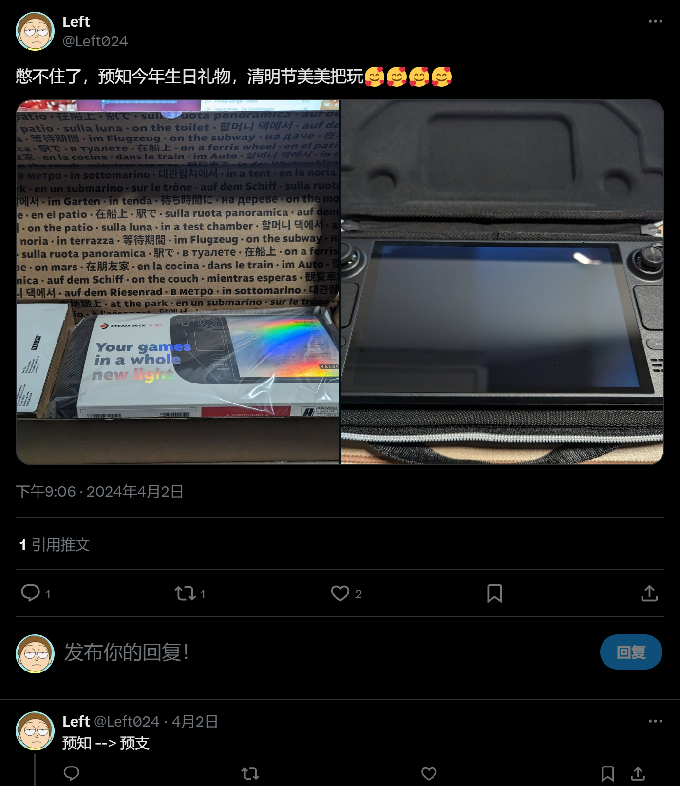 很早就想买 SteamDeck 了,因为价格因素以及感觉吃灰概率比较高就一直没下手,但到了这个月生日临近,以及价格已经跌到了算是比较合理的范围,也就忍不住下单了(给自己买生日礼物真是个绝佳的借口