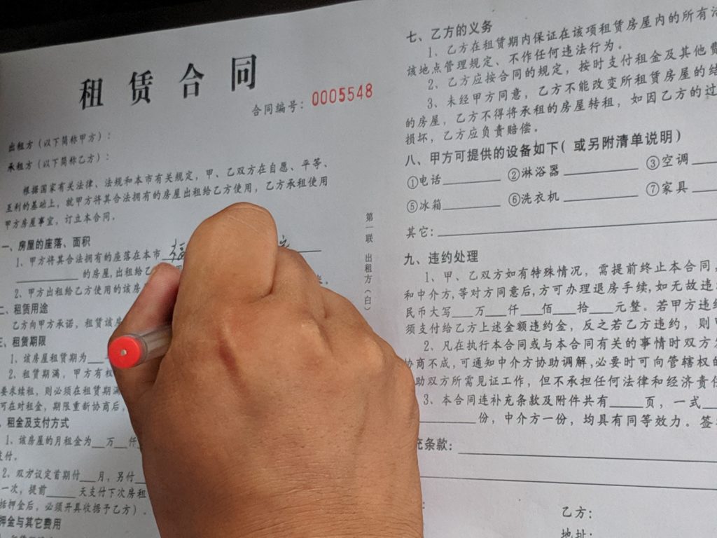 定下来房子后就是签合同了,交三押一,就是一次性交三个月的房租,然后每三个月交一次房租,水电气另外交,还要交1600×0.35=560的中介费。