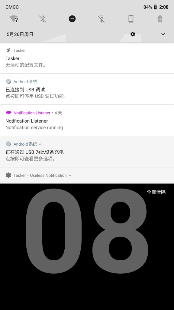 当连到电脑时,通知栏会有个通知“已连接到USB通知”(开发者选项打开USB调制模式),通过检测这条通知来判断是否打开软件。
