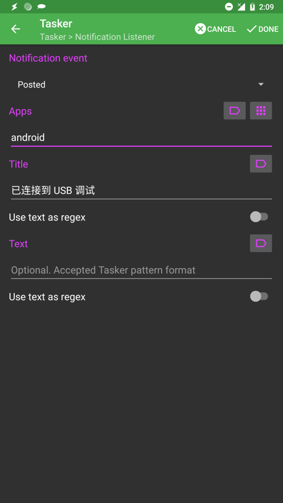 然后在Title一栏将通知的标题内容填进去“已连接到 USB 调试”(注意USB两边是有空格的,不同手机可能会有不同),然后点击右上角的Done保存。
