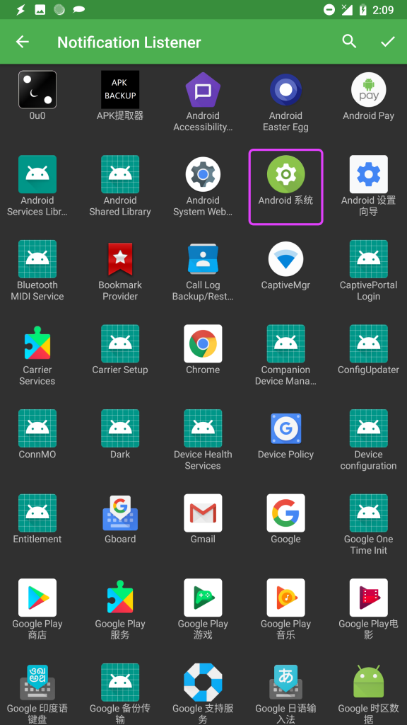 点击Apps旁边的小九宫格按钮选择通知的软件,这个通知是由Android系统发出来的,我们选择它。
