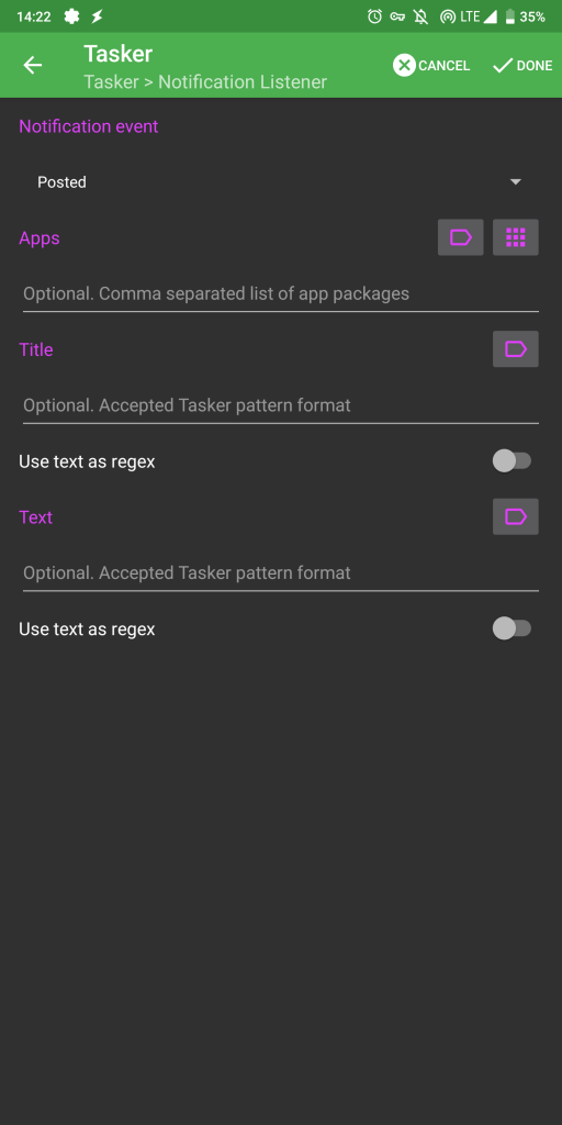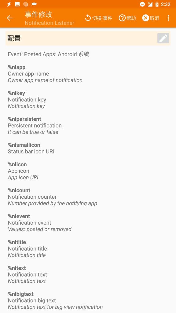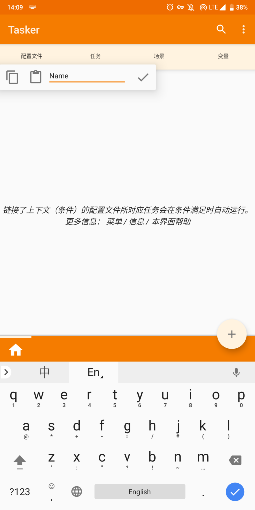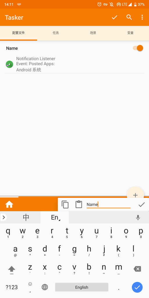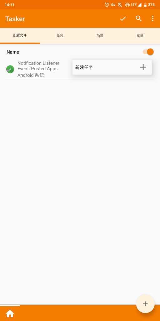 接下来配置检测到通知后要执行的操作,点击完Done后会回到Tasker,可以看到配置下面已经填好了代码,再返回会弹出新建任务,点击它,随便取个名字。